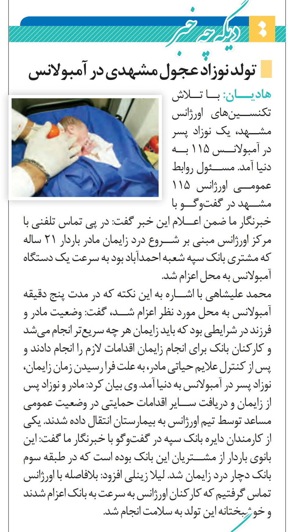هادیــان خبرنگار روزنامه قدس: بــا تلاش تکنســینهای اورژانس مشــهد، یک نوزاد پسر در آمبولانس ۱۱۵ بــه دنیا آمد.