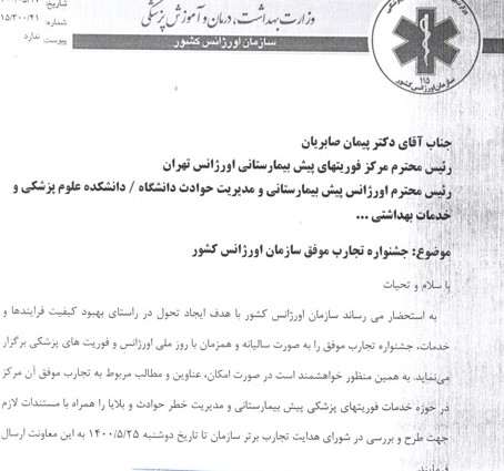 مطابق فراخوان جشنواره تجارب برتر سازمان اورژانس کشور و ارسال پیشنهادات تا تاریخ 25 مرداد 1400 همکاران می توانند پکیج اجرایی و کامل تجربه و پیشنهادات اجرایی خود را به روابط عمومی مرکز به ادرس ایمیل این آدرس ایمیل توسط spambots حفاظت می شود. برای دیدن شما نیاز به جاوا اسکریپت دارید ارسال نمایند بعد از تاریخ امکان ارسال وجود ندارد